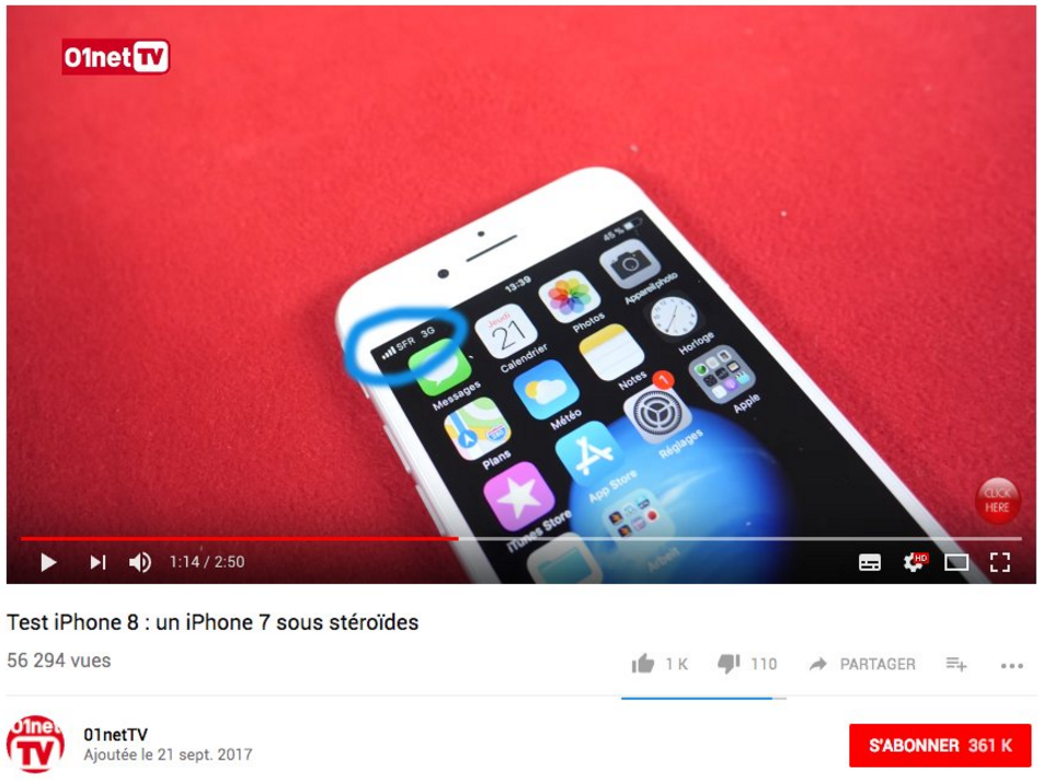 Humour. Alors que l’iPhone 8 et X sont sur toutes les bouches, le site d’info 01net, propriété de SFR , en a profité pour tester le 21 septembre en vidéo le successeur de l’iPhone 7. Le tout en partenariat avec l’opérateur au carré rouge. Si l’initiative est louable et habituelle, une contradiction a été relevée dans ladite vidéo. En effet, un écran dixit dans les premières secondes" en partenariat avec SFR, plus grand réseau 4G", par conséquent la logique voudrait que le nouveau né d’Apple soit connecté au réseau 4G de SFR lors de ce test. Pourtant l’iPhone 8 reste comme figé sur le réseau 3G de l’opérateur tout au long de la vidéo. Les locaux de 01net étant situés dans le 15ème arrondissement, la 4G devrait y régner en maître… Ce n’est visiblement pas le cas, la couverture indoor chez nos confrères laisse donc à désirer si cette démonstration a réellement été enregistrée dans leur QG… un comble pour un site spécialisé dans les nouvelles technologies !
