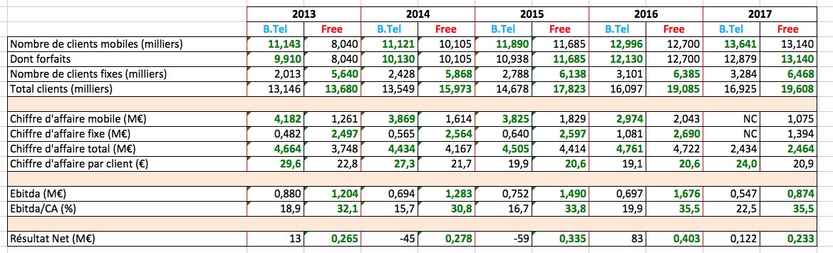 Concernant les résultats financiers, le chiffre d’affaires des 2 opérateurs sont très proches. Avec 2,464 millions d’euro au 1er semestre 2017, Free reste ainsi devant son concurrent avec seulement 30 millions d’avance. Par contre, les clients de Bouygues Télécom rapportent davantage que ceux de Free : 24,0€/client au 1er semestre 2017 contre 20,9€ pour Free