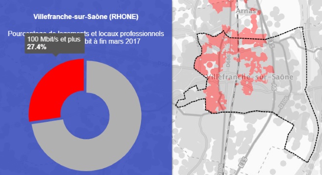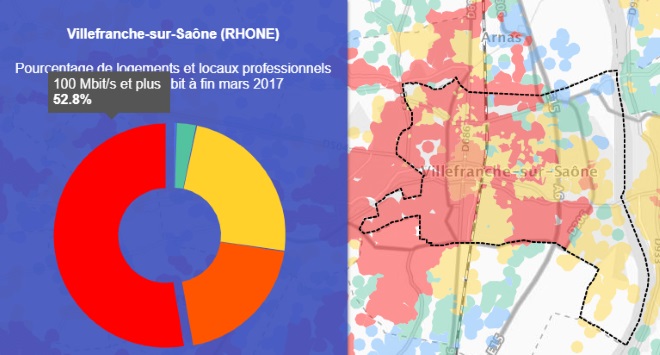 Grâce à la première carte on peut voir que la ville de Villefranche-sur-Saône est couverte à 72,8% par le très haut débit.