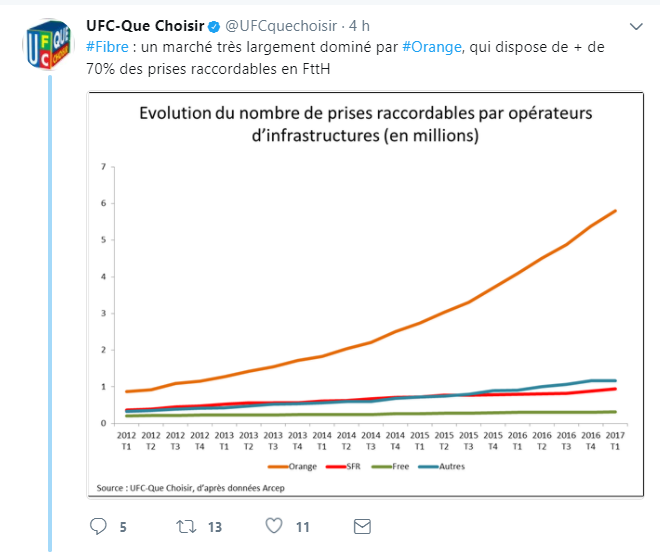 Ce matin, l’UFC Que Choisir a publié un graph, repris sur les données de l’ARCEP, qui est censé afficher le nombre de prises raccordables par opérateur, et qui montre qu’Orange domine largement avec 70% des prises raccordable en FTTH.