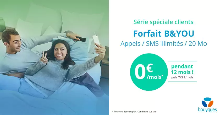 Bouygues Télécom vient de lancer une nouvelle offre qui s’adresse à ses clients déjà abonnés (une offre qui n’est donc pas substituable à la ligne mobile déjà existante). Ceux-ci peuvent ouvrir une nouvelle ligne pour bénéficier d’un forfait B&You pour 0€ la première année puis 7,99€/mois, qu’il s’agisse de la création d’une nouvelle ligne ou d’une portabilité. Ce forfait intègre les appels illimités, les SMS et MMS illimités ainsi que 20Mo de Data. Cette offre est disponible sur l’espace abonné.