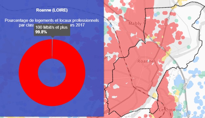 Grâce à la première carte on peut voir que la ville de Roanne est couverte à 99,8% par le très haut débit.