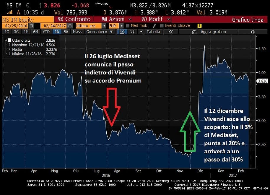 Illustration La Repubblica sur la baisse du cours de Mediaset. En rouge lle désengagement de Vivendi sur Mediaset. En vert, le moment ou Vivendi monte au capital.
