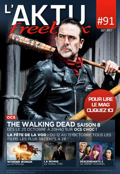 Free vient de publier son magazine AKTU Freebox du mois d’octobre. Comme tous les mois, l’AKTU Freebox fait le tour de l’actualité télévisuelle de la Freebox. En couverture de ce numéro 91, on retrouve la série The Walking Dead, dont la saison 8 débute le 23 octobre sur OCS. L’AKTU Freebox est également disponible sur le site de Free ou en PDF ci-dessous.