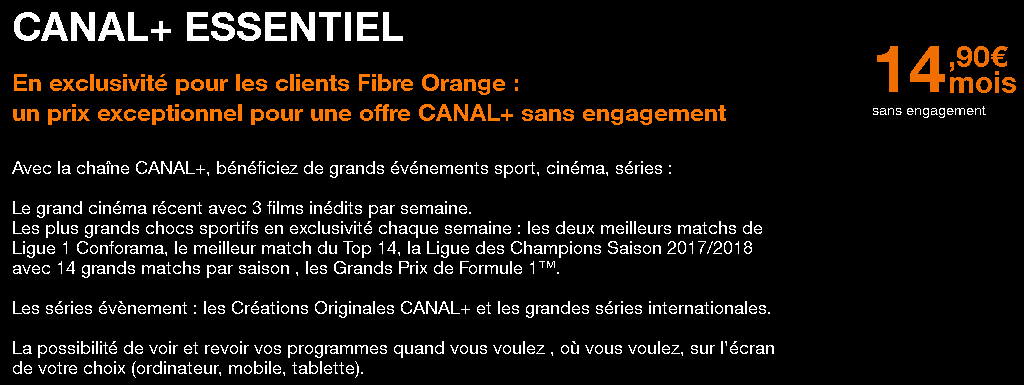 C’est une nouvelle formule de commercialisation que vient d’inaugurer Orange en proposant le bouquet « Canal+ Essentiel », qui intègre la chaîne Canal+ et la chaîne Canal+ décalé, en tant que chaînes optionnelles "ordinaires" de son bouquet TV. Il est donc dorénavant possible de s’abonner à la chaîne cryptée comme n’importe quelle autre chaîne du bouquet TV d’Orange. Cette offre est proposée uniquement aux abonnés fibre de l’opérateur et il en coûtera 14,90€/mois, avec l’accès à myCanal inclus.