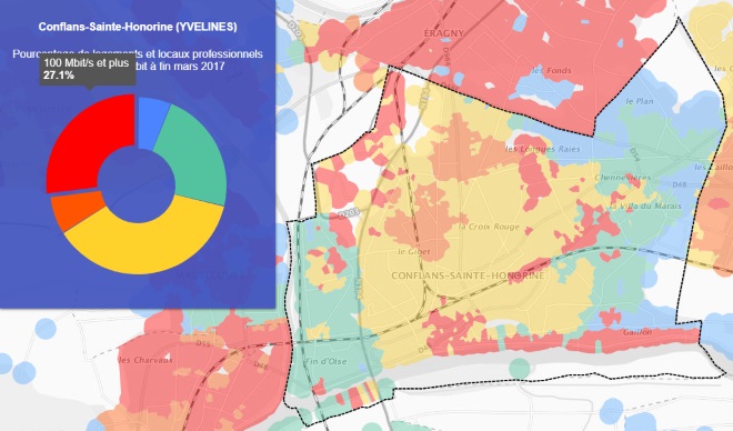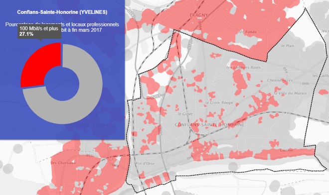 Grâce à la première carte on peut voir que la ville de Conflans-Sainte-Honorine est couverte à 27.1% par le très haut débit.