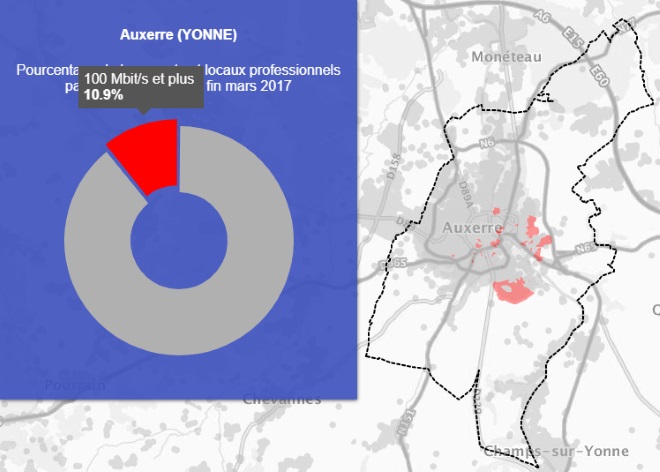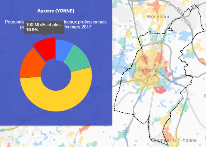 Grâce à la première carte on peut voir que la ville de Auxerre est couverte à 26.3% par le très haut débit.
