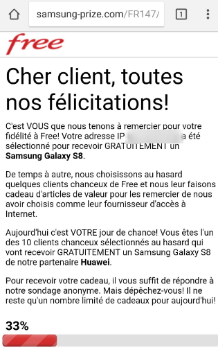 Mais si certaines fois ces phishing sont si bien réalisés que l’on peut avoir un doute, d’autres fois, le doute n’est pas de mise. C’est le cas avec ce nouveau filoutage de type « concours », rapporté par Damien. Dans le message censé être envoyé par Free, il est ainsi indiqué que vous avez gagné un Samsung Galaxy S8 et que pour recevoir ce cadeau il faut répondre à une série de questions. Mais là où c’est très fort, c’est que le message indique que c’est un Samsung Galaxy S8 « de notre partenaire Huawei ». Vivement le prochain iPhone X d’Alcatel !