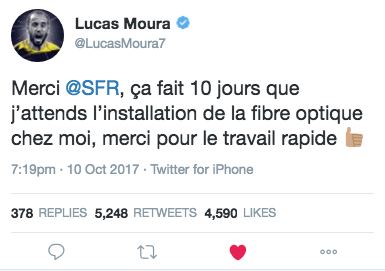 Fans de foot, le joueur brésilien du Paris Saint-Germain Lucas (Moura) est en froid avec SFR et attend toujours la fibre à défaut de marquer des buts. Bouygues à l’affût comme toujours !