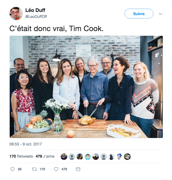 Tim Cook, le patron d’Apple a joué la carte de l’omniprésence cette semaine en France avec la visite d’une usine partenaire près de Caen, une rencontre avec Emmanuel Macron mais aussi en se laissant tenter par une séance "cordon bleu". Un twittos a d’ailleurs osé une blague téléphonée :