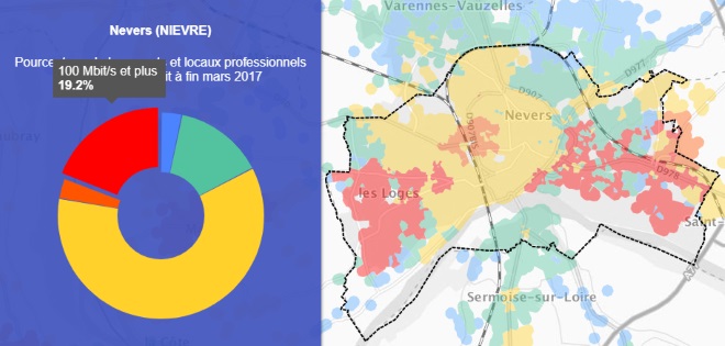 Grâce à la première carte on peut voir que la ville de Nevers est couverte à 22.4% par le très haut débit.