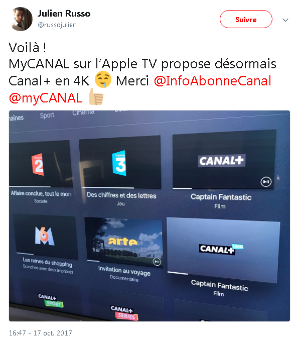 Le groupe Canal+ vient de lancer la chaîne Canal+ UHD, toutefois, il faut réunir de nombreuses conditions pour en bénéficier. La chaîne est disponible sans surcoût pour les abonnés Canal+, mais il faut disposer d’une Apple TV 4K, d’un téléviseur compatible, de la dernière version de l’application myCANAL et d’une connexion Internet haut débit (à partir de 20Mbps). Les utilisateurs pourront bénéficier d’une qualité d’image jusqu’à 4 fois supérieure au Full HD. Les programmes en 4K / Ultra HD proposent de plus un son en Dolby Digital+ 5.1 de très haute qualité.