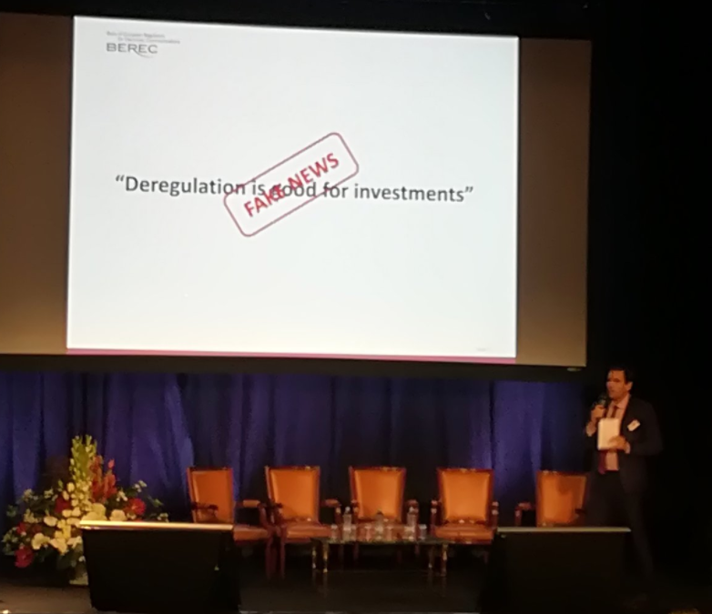 Le DG de Free a notamment commencé par insister sur le rôle moteur de la concurrence qui stimule les investissements en prenant l’exemple de la France où les investissements sont très élevés, portés par la compétition puisque les revenus stagnent. Il a ensuite poursuivi en expliquant qu’il n’y a pas besoin de dérégulation : la régulation permet au contraire de stimuler les investissements : "un relâchement dans les processus de régulations ne pourrait que produire un relâchement dans les investissements". Une position partagée par Sébastien Soriano, président de l’ARCEP et du BEREC qui lorsqu’il a pris la parole a dénoncé la fake news suivante, "la dérégulation est une bonne chose pour les investissements".