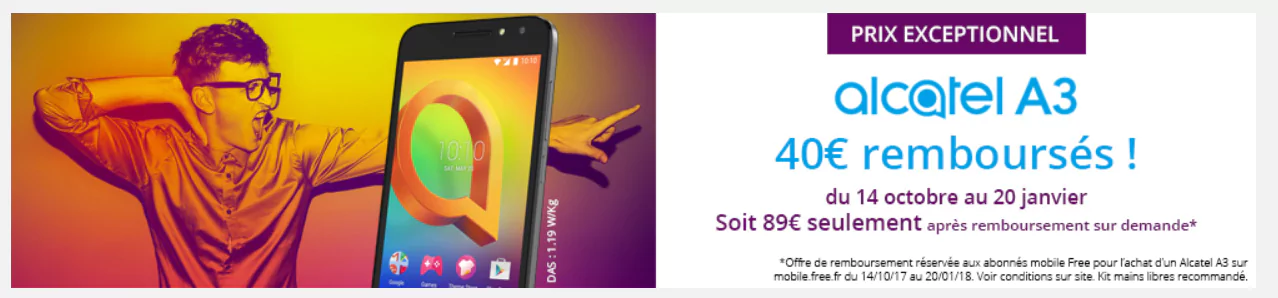 Pour les budgets "restreints", 40 euros son remboursés pour tout achat d’un Alcatel A3 16Go dans la boutique Free Mobile jusqu’au 20 janvier 2018.
