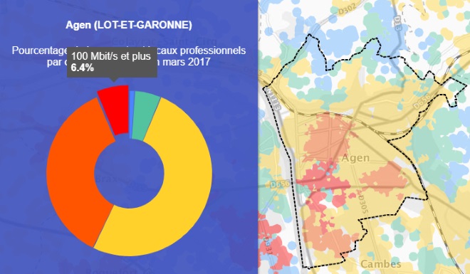 Grâce à la première carte on peut voir que la ville de Agen est couverte à 42.9% par le très haut débit.