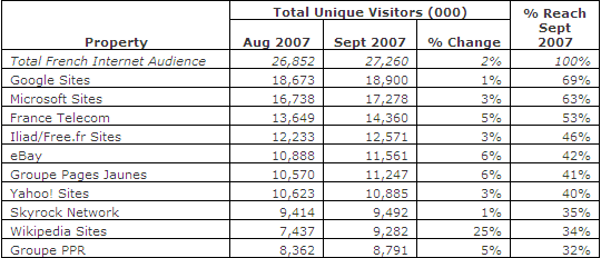 Toujours en tête du classement, le géant Google totalise 18,9 millions de visiteurs uniques au mois de Septembre 2007, talonné par Microsoft (17,2 millions) et France Télécom (14,3 millions).