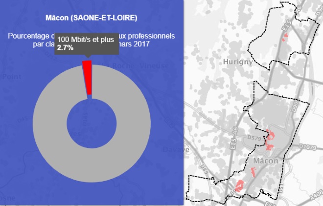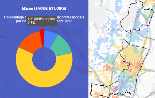 Grâce à la première carte on peut voir que la ville de Mâcon est couverte à 18% par le très haut débit.