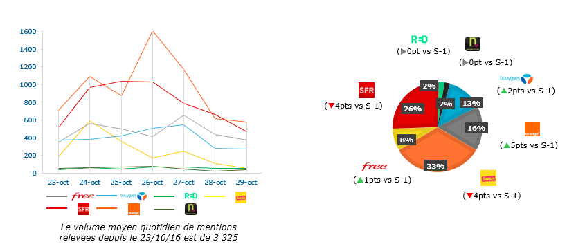 Netino (Webhelp) et Synthesio viennent de publier leur étude hebdomadaire sur la perception sociale des principaux opérateurs télécoms sur le marché français pour la semaine du 23 au 29 octobre 2017. Cette étude se base sur la collecte automatique des données sur un corpus de plus de 600 000 000 sites, blogs, forums, profils Facebook et Twitter.