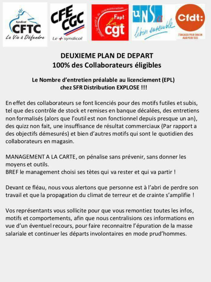 L’explosion du nombre d’entretien préalable au licenciement chez SFR Distribution préoccupe grandement les syndicats. Cinq syndicats (CFTC, CFE-CGC, CGT, UNSA, CFDT) dénoncent des motifs de licenciement “futiles et subis” dans un communiqué. Parmi eux “ des entretiens non formalisés (alors que l’outil est non fonctionnel depuis presque un an), des quizz non faits, une insuffisance de résultat commerciaux (par rapport à des objectifs démesurés)”.