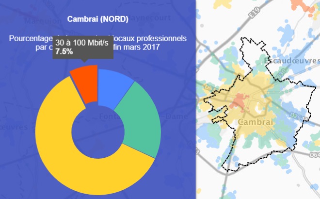 Grâce à la première carte on peut voir que la ville de Cambrai est couverte à 7.5% par le très haut débit.