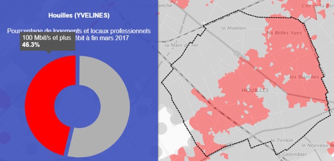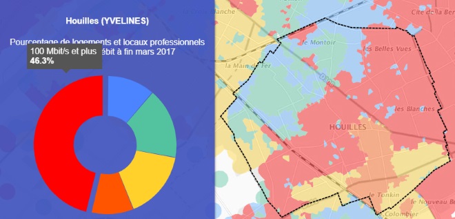 Grâce à la première carte on peut voir que la ville de Houilles est couverte à 56.2% par le très haut débit.