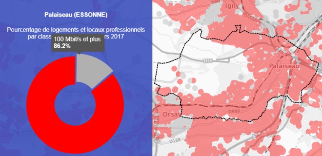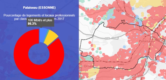 Grâce à la première carte on peut voir que la ville de Palaiseau est couverte à 86.3% par le très haut débit.