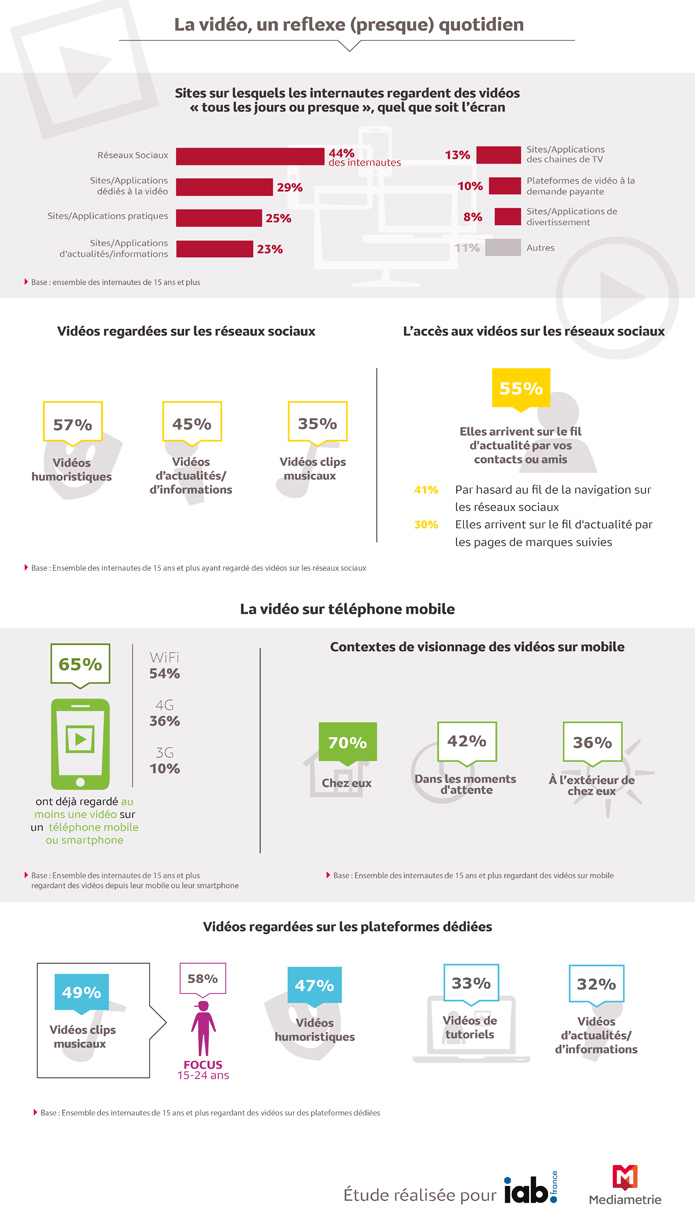 Ils sont plus de 60% à déclarer regarder une vidéo “tous les jours ou presque tous les jours” et plus de 70% sur une semaine. Les jeunes de 15 à 24 ans sont les plus gros consommateurs de vidéos, ils sont 84% à en visionner une quasi quotidiennement.