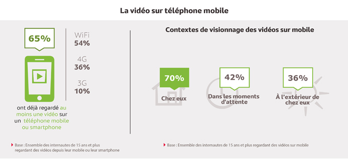 Selon l’étude, 70% de des internautes de 15 ans et plus regardant des vidéos sur mobile affirme les visionner depuis leur domicile (42% dans les moments d’attente et 36% à l’extérieur). Plus de la moité (54%) utilisent leur connexion Wi-Fi (34% en 4G et 10%en 3G).