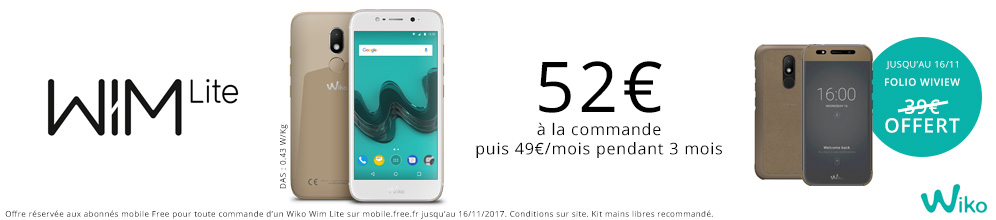 Wiko WIMlite : Du nouveau pour ce smartphone qui se voit associer un folio WIView offert (valeur 39€) : Couleur beige avec Wimlite Gold / Couleur noir avec Wim lite Rouge ou Black. Cette offre est valable jusqu’au 16 novembre.