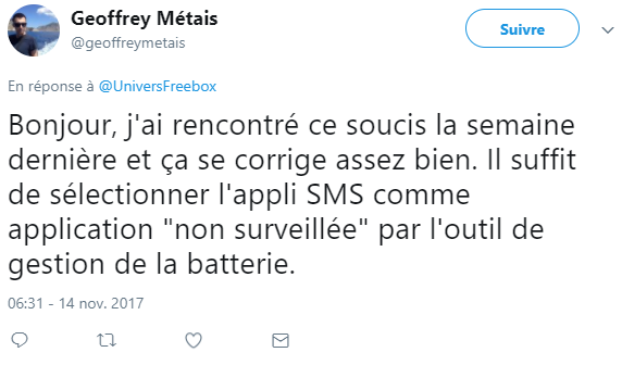 MAJ : D’après Geoffrey sur Twitter, le problème peut être réglé en sélectionnant l’application SMS d’origine comme une application "non surveillée" par l’outil de gestion de la batterie de l’appareil.