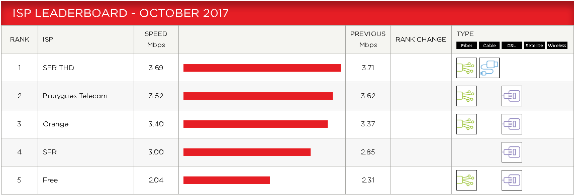 Concrètement, au cours du mois d’octobre SFR "câble et FTTH" affichait un débit moyen de 3,69 Mbits/s, en légère diminution, alors que Bouygues Télécom, affiche 3,52 Mbits/s, en diminution également depuis le mois dernier. A la 3ème place on trouve Orange avec 3,40 Mbits/s suivi par SFR "ADSL" avec 3,00Mbits/s. Enfin, à la dernière place, Free affiche un débit moyen de 2,04 Mbits/s.