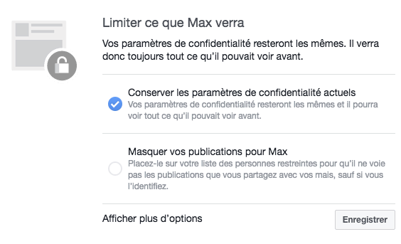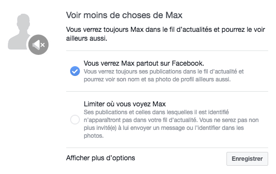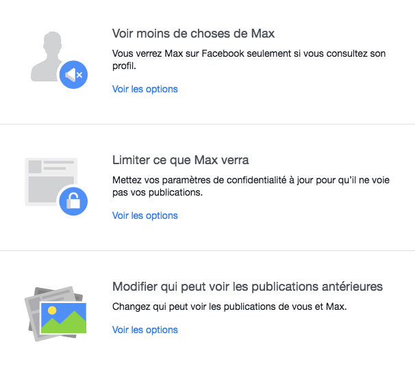 Concrètement, une fois renseigné le nom de l’ami sur cette page, les ponts seront momentanément coupés, sans qu’il le sache : il ne pourra plus voir vos publications, vous ne verrez plus les siennes. Vous pourrez toujours aller consulter son profil, et si vous décidez que la quarantaine a assez duré, il vous suffira de le suivre à nouveau pour revoir ses publications. La fonctionnalité qui ne se substitue pas à Ne plus suivre ou Retirer de mes amis offre différents niveaux de filtrages et vous propose également de retirer la personne de votre liste d’amis ou de la bloquer directement depuis cette interface.