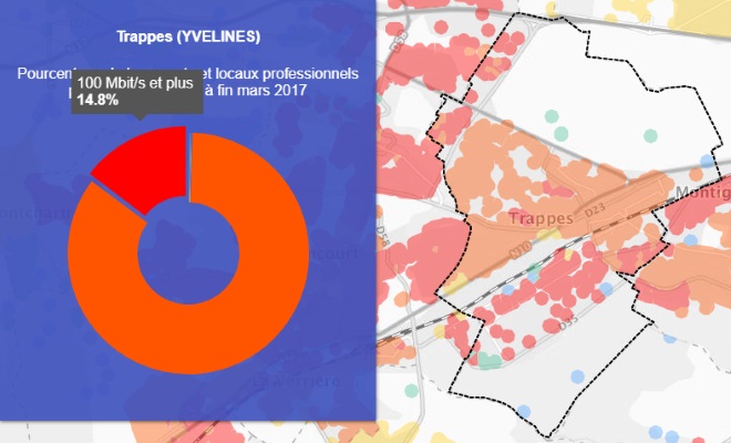 Grâce à la première carte on peut voir que la ville de Trappes est couverte à 99.6% par le très haut débit.