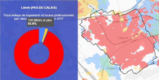 Grâce à la première carte on peut voir que la ville de Liévin est couverte à 93.9% par le très haut débit.