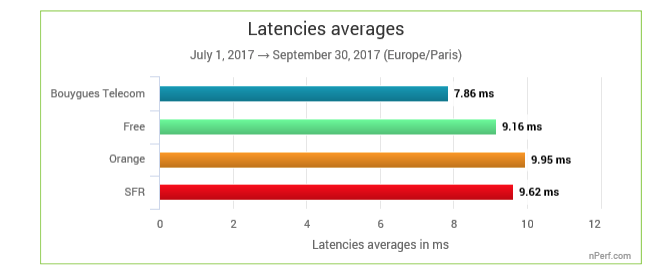 Enfin, Bouygues Telecom a proposé la meilleure latence FTTH au cours du troisième trimestre 2017 alors qu’il était ex aequo avec Free au T2. Seul l’opérateur de Xavier Niel voit sa latence s’allonger de 0,68 ms alors que les trois autres opérateurs améliorent leurs performances de moins d’une milliseconde. Free est toutefois second au classement.
