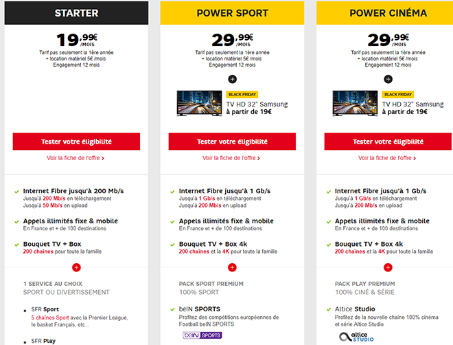 A l’occasion du Black Friday, SFR lance des promotions à tout va, notamment sur ses abonnements ADSL et Fibre. Ainsi sa box Starter est actuellement proposée à vie à 24,99 euros (location incluse) mais aussi ses offres Power Sport (Bein Sports + SFR Sport) et Power Cinéma (Altice Studio + SFR Play) affichées à 34,99 euros (location de la box incluse) sans limite de durée. Et comme si ce n’était pas suffisant, l’opérateur au carré rouge intègre dans ces deux offres Power, un téléviseur Samsung TV HD 80cm à 19€ au lieu de 269€ ou Full HD Smart de la même taille à 89€ au lieu de 449€. Attention, les stocks sont limités. A noter toutefois, qu’il n’est pas précisé dans les mentions légales si les options incluses dans le pack Sport et Cinéma deviendront ou non payantes dans un an, comme ce fut le cas par le passé.