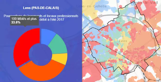 Grâce à la première carte on peut voir que la ville de Lens est couverte à 93.5% par le très haut débit.