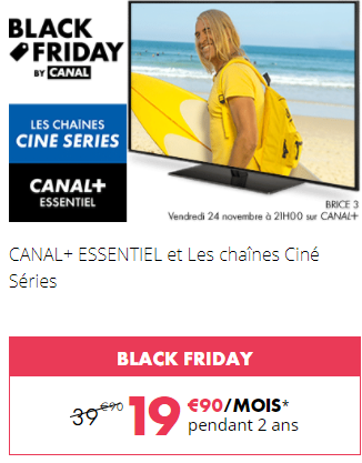 Depuis le début de la semaine et à l’occasion du Black Friday, Canal propose chaque jour une nouvelle offre, valable un seul jour. Aujourd’hui, c’est l’offre ESSENTIEL & LES CHAINES CINE SERIES qui est proposé à 19,90€/mois pendant 24 mois. Une offre valable uniquement aujourd’hui 24 novembre