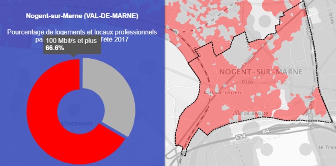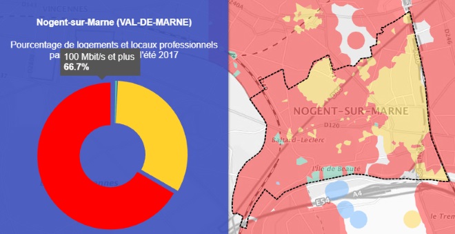 Grâce à la première carte on peut voir que la ville de Nogent-sur-Marne est couverte à 66.7% par le très haut débit.