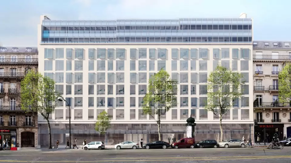 « prestigieux hall double hauteur tout en transparence, reliant le boulevard aux jardins intérieurs. Ainsi que de plusieurs terrasses offrant pour certaines des vues panoramiques sur la Tour Eiffel » rapporte