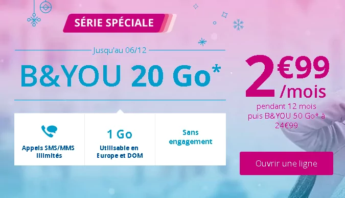 Le forfait de Bouygues Télécom est donc proposé au plus cher que le tarif promotionnel de Free Mobile à 0,99€/mois, et avec moins de data (20Go contre 100Go pour Free) et seulement 1 Go de data en roaming en Europe. Toutefois, Bouygues Télécom dispose d’un plus grand réseau 4G, ce qui peut donc être intéressant pour ceux qui sont mal couverts en 4G par Free Mobile.