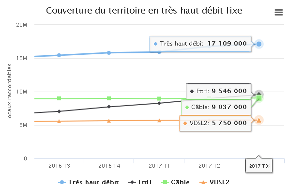 Au total, à la fin du 3e trimestre 2017, 17,1 millions de logements étaient éligibles à des services à très haut débit, toutes technologies confondues, dont 11,2 millions en-dehors des zones très denses. Parmi ceux-ci, 9,546 millions de foyers sont éligibles à la fibre. Ils devraient dépasser les 10 millions au trimestre prochain.