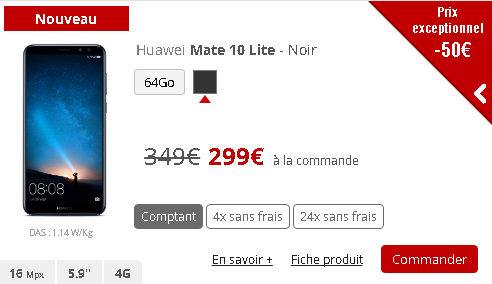 Le deuxième smartphone qui bénéficie d’une baisse temporaire de tarif est le Huawei 10 Lite. Il est proposé, jusqu’au 28 décembre, au prix exceptionnel de 299€ au lieu de 349€, soit 50€ d’économie. Cette offre est valable également pour le paiement en plusieurs fois sans frais : en 4 fois sans frais : 77€ puis 74€ durant 3 mois