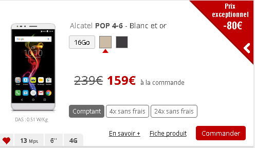Enfin, l’Alcatel Pop 4-6 est proposé, jusqu’au 28 décembre au prix exceptionnel de 159€ au lieu de 239€, soit 80€ de baisse. Il est également disponible en plusieurs fois sans frais : 4 fois : 42€ puis 29€ durant 3 mois et en 24 fois : 39€ puis 5€ durant 24 mois