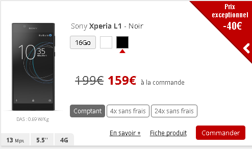 Tout d’abord le Sony L1 est proposé à 159€ au lieu de 199€ soit une baisse de 40€. Cette offre est valable jusqu’au 21 décembre. A noter que la promo est également appliquée sur le paiement en plusieurs fois sans frais : en 4x : 42€ puis 39 € durant 3 mois et 24X : 15€ puis 6€ durant 24 mois