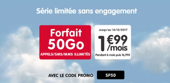 Il s’agit d’un forfait sans engagement Appels/SMS/MMS illimités (3h max/appel et 129 destinataires différents max/mois) et 50 Go à 1.99€/mois pendant 6 mois puis 16.99€/mois. Une modalité spécifique et peu courante est toutefois à relever : "la réduction est applicable à compter de la seconde facture". Par ailleurs, la carte SIM est gratuite pour l’achat d’un mobile concomitant, dans le cas contraire celle-ci est facturée 5 euros.