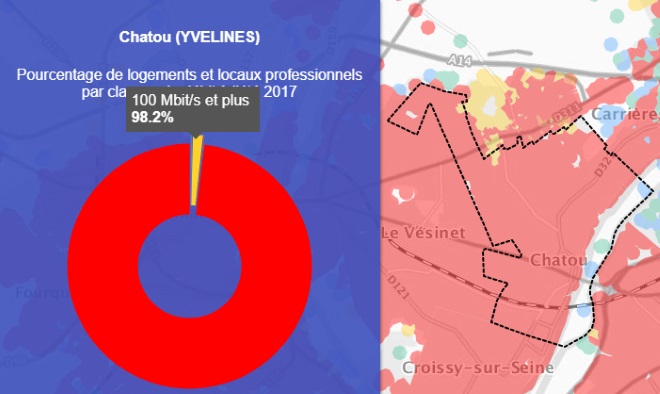 Grâce à la première carte on peut voir que la ville de Chatou est couverte à 98.2% par le très haut débit.