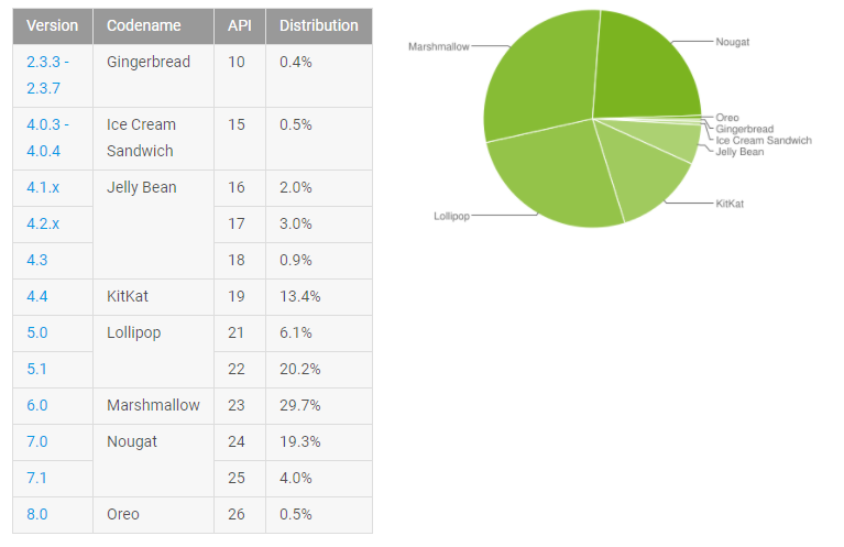 Les résultats sont plutôt décevants pour la dernière version Android 8.0 Oreo qui n’affiche qu’une part de marché de 0,5% depuis sa sortie en août dernier. Les versions les plus utilisées restent Android 6.0 Marshmallow (29,7%) suivie de Android 5 Lollipop (23,6%) et enfin Android 7 Nougat avec 23,3%.