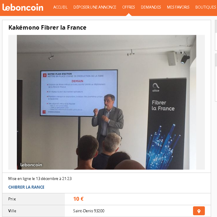 Avec humour, un internaute a ainsi mis à la vente sur Le Bon Coin une série de Kakémonos « Fibrer la France » pour 10€. L’annonce indique " Je vends un lot de superbes kakémonos neufs "Fibrer la France" du nom du plan pour fibrer la France envisagé un temps par Altice mais finalement abandonné le 12 décembre 2017 dans la surprise générale. Idéal pour décorer des bureaux ou comme déco pour une chambre de geek."