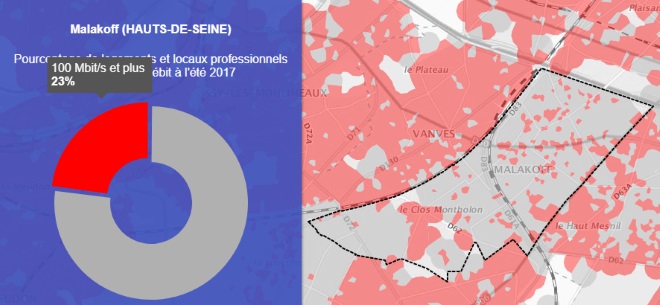 Grâce à la première carte on peut voir que la ville de Malakoff est couverte à 95% par le très haut débit.